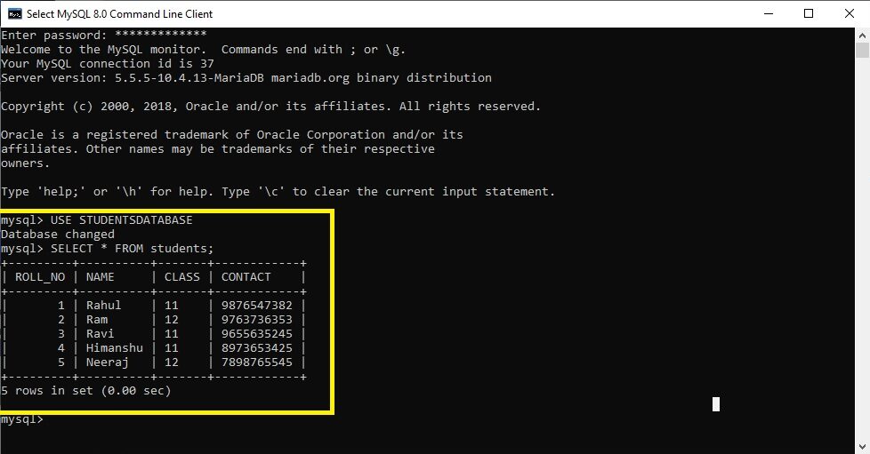 not single inverted quote(') to specify the Table columns names like `name`, `roll_no`, `class`, and `contact`. Now you can open your MySQL Command Line Client and run the