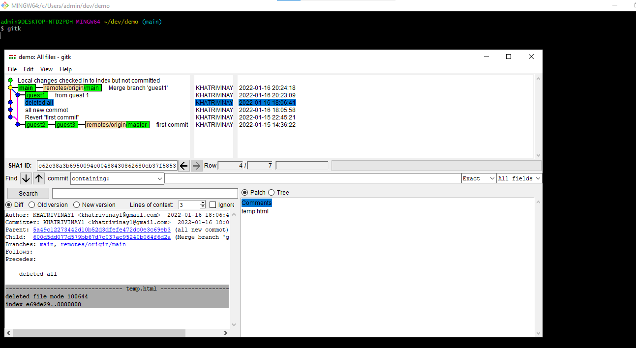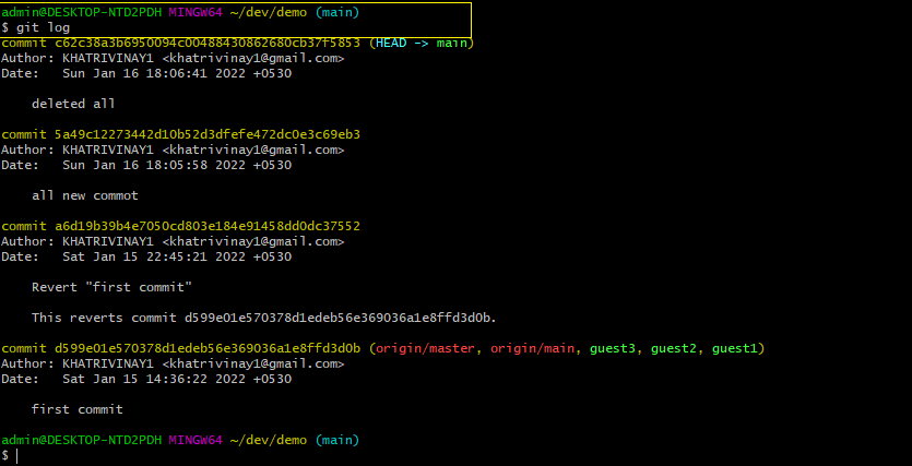 Note: After executing the git revert command, the vi editor will open to set the new revert commit message. To quit from the vi editor, you can press ESC+:w+q and hit enter.