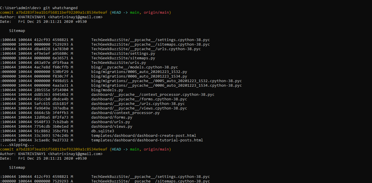 The whatchanged git command works similarly to the git log command. It also shows the commit details along with the difference that each commit introduces in the repo.