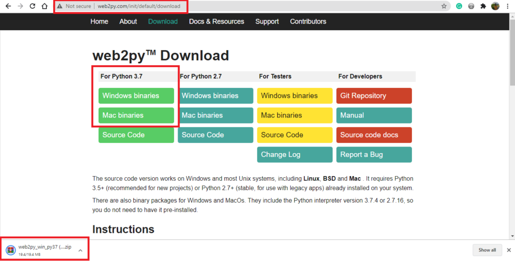Unlike other Python web frameworks , you might find difficulties or errors installing web2py using the Python pip install command . So the easiest way to install web2py is by downloading it binary file from its official website and unzipping it. Download web2py from here