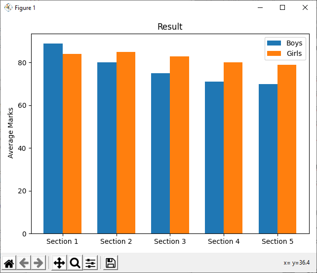 import matplotlib import matplotlib.pyplot as plt import numpy as np sections = ['Section 1', 'Section 2', 'Section 3', 'Section 4', 'Section 5'] boy_means = [89, 80, 75, 71, 70] girl_means = [84, 85, 83, 80, 79] x = np.arange(len(sections)) width = 0.35 fig, ax = plt.subplots() rects1 = ax.bar(x - width/2, boy_means, width, label='Boys') rects2 = ax.bar(x + width/2, girl_means, width, label='Girls') ax.set_ylabel(' Average Marks') ax.set_title('Result') ax.set_xticks(x) ax.set_xticklabels(sections) ax.legend() fig.tight_layout() plt.show()