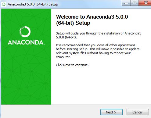 As mentioned earlier, Python does not come with the anaconda package. So you need to download the anaconda package from its official website . After the download process is completed, you can double-click the executable file to start the installation process for anaconda. You will get to see the anaconda installer, which looks like the one shown below: