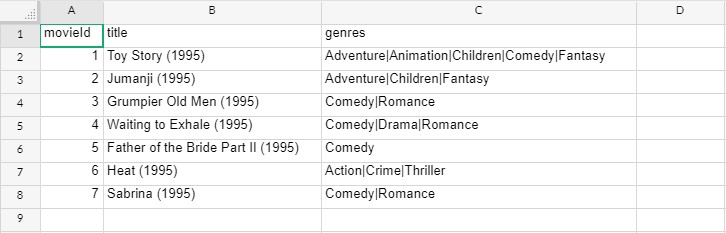 {'movieId': '7', 'title': 'Sabrina (1995)', 'genres': 'Comedy|Romance'}