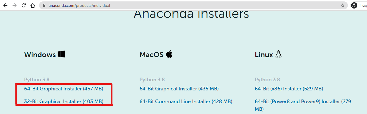 edition. From there, you can install the relevant Anaconda for your system. Right now, we are using windows, so we are downloading the Windows version, as demonstrated follows: