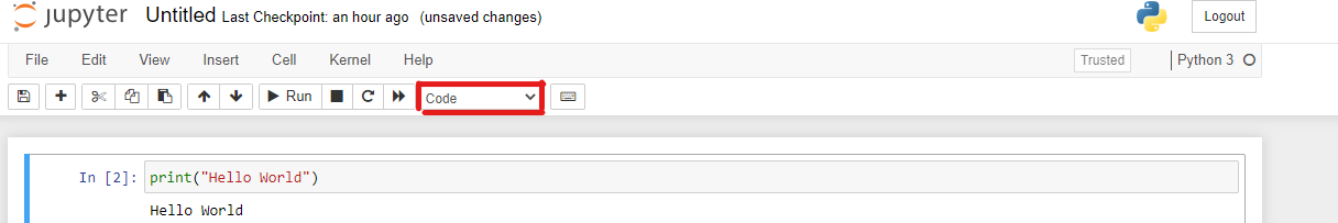 The type of Cell selected can be toggled from the menu. To execute the code and markdown written in the cell, use the