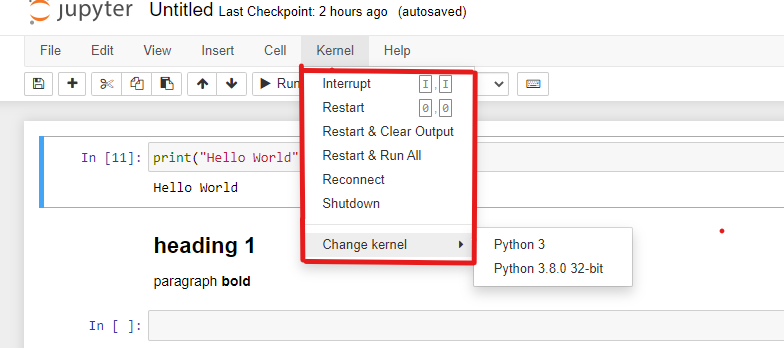 Every notebook consists of a kernel. The kernel is the computing engine that executes the code written in the cell. The kernel is responsible for executing and showing code output. When we create our New notebook, we select Python3, and this set Python3 as a kernel for our notebook. Jupyter Notebook supports 40+ programming languages along with their different versions. And from the kernel menu, we can change our existing kernel.