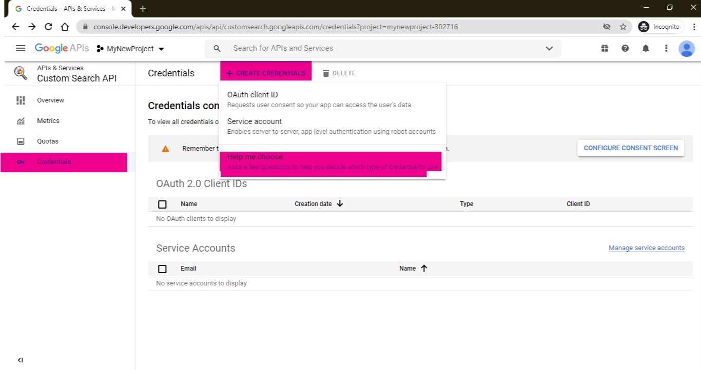 After Enabling the API, you need to go to Credentials . There, click on CREATE CREDENTIALS , and select the Help me choose option.