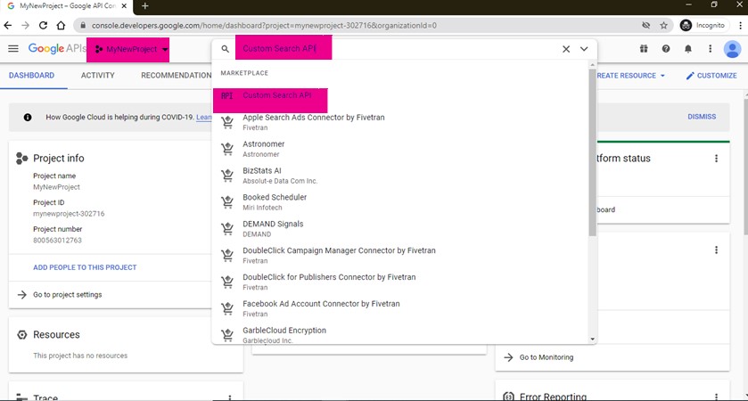 After creating the project, select it and search for the Custom Search API using the Dashboard Search Bar, and click on the first option.