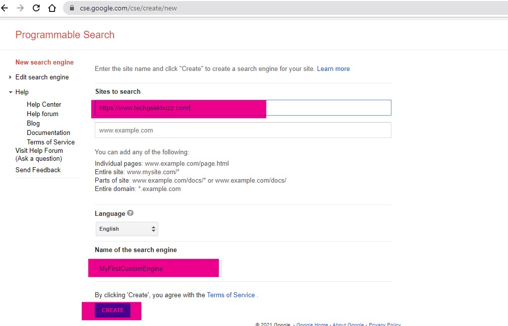 Also, we will be giving our custom search engine the name of MyFirstCustomEngine. After filling in the Name and Sites to search, click the create button.