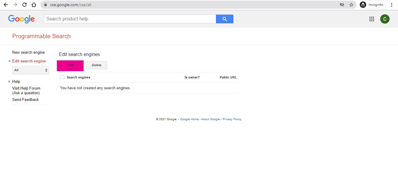 Now we are done with setting the API. Next, we need to create a Custom Search Engine, and to create a Custom Search Engine, we need to visit https://cse.google.com/cse/all . Now, click on the Add button.