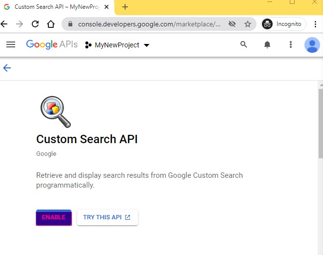 Now, click on the ENABLE button, and this will enable the Custom Search API for our current project.