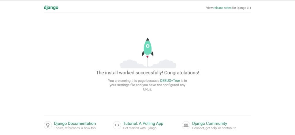 After running the local server, open localhost:8000 on the browser, and you will see the default app page of Django.