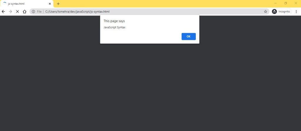 <!DOCTYPE html> <html> <head> <title></title> <!-- External JavaScript --> <script src="js-external.js"> </script> </head> <body> <h1>JavaScript Syntax Tutorial External JavaScript</h1> </body> </html>The Internal JavaScript and External JavaScript will work the same, but when you work on big projects, there you need to keep your project modular. In that case, you need to create separate JavaScript files for JavaScript code.