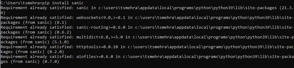 As Sanic is a third-party open-source Python framework, we first need to install it for our Python environment. We can either use a Python virtual environment or directly install sanic for our global Python. To install sanic, we can use the Python pip install terminal command.