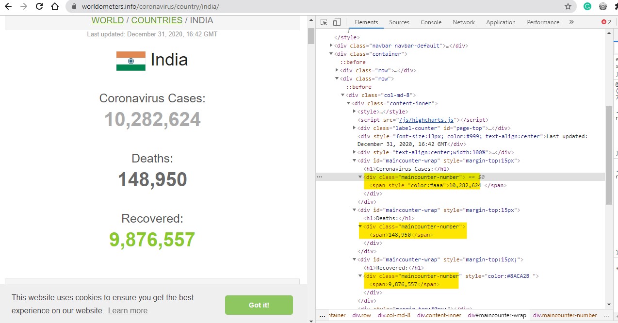 Access Internet Data with Python Example Let's extract the data of covid cases in India, from the official website of the worldometer, and access total number of Coronavirus Cases, Death and Recoveries.