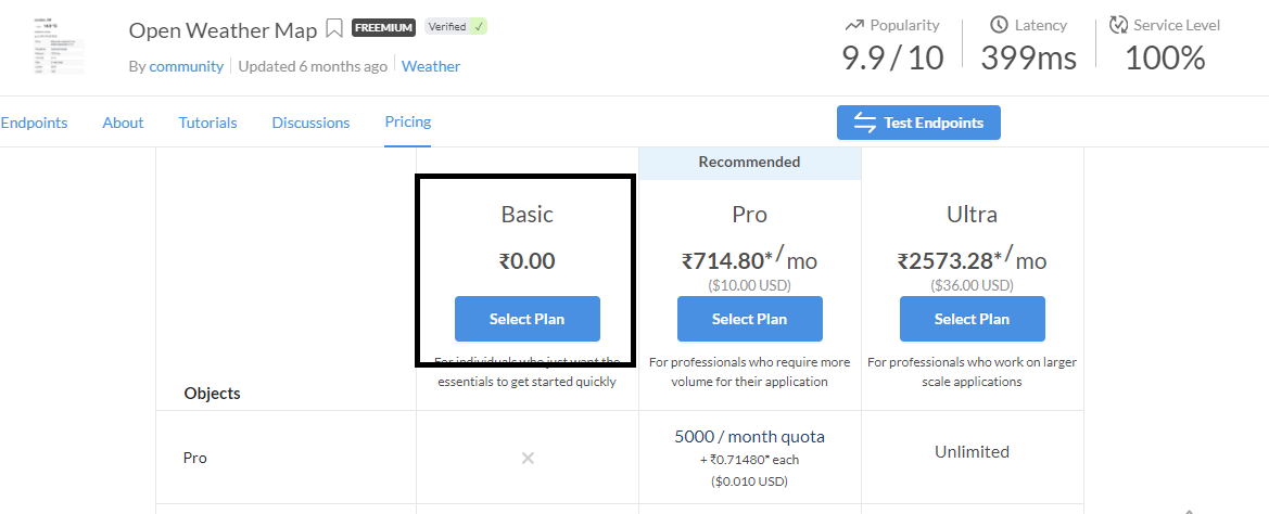 After clicking on the Subscribe to Test button, you need to select the plan you want to pick. You can select the Basic plan, which is free to use and has only limited hits, which is around 500 per month. This is enough to get started with this API.