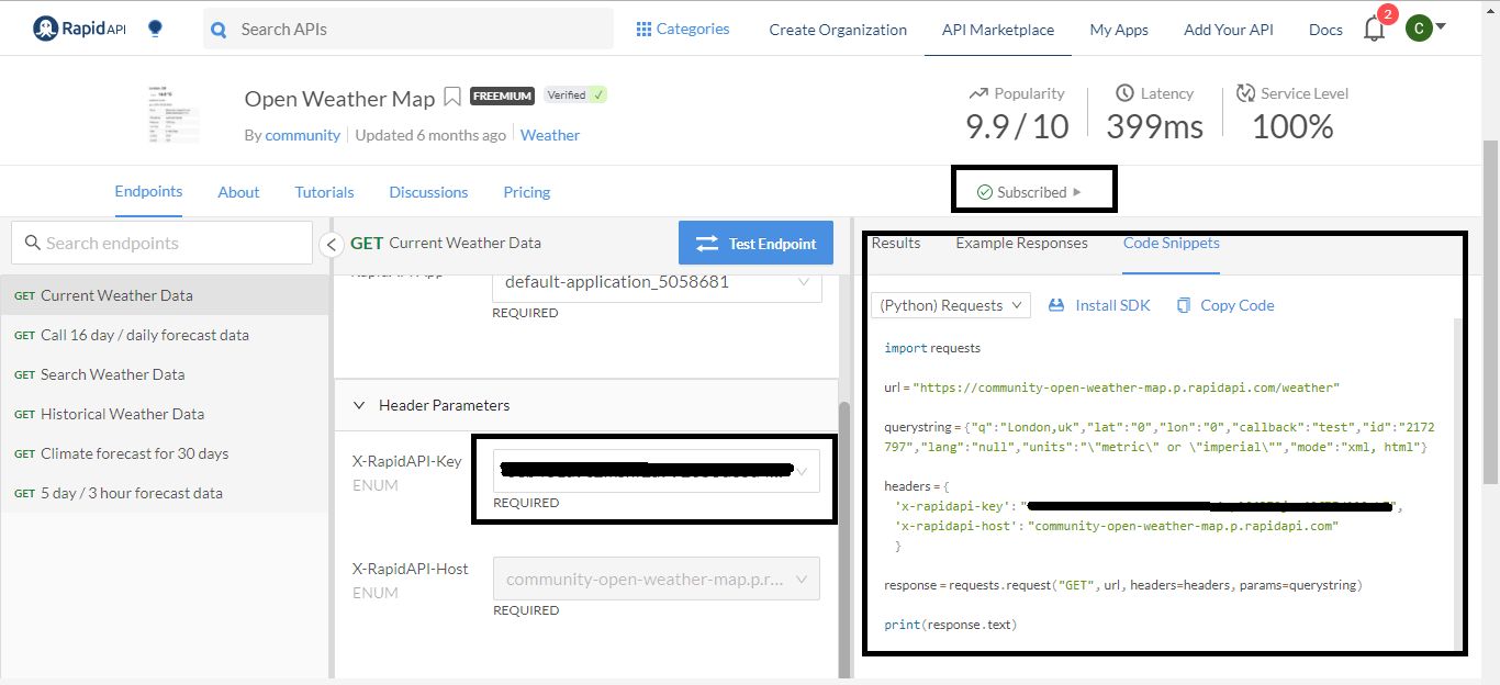 We have subscribed to rapidapi.com's Open Weather Map API and got its API key, and installed the Python requests library to send HTTP requests to the API endpoint.
