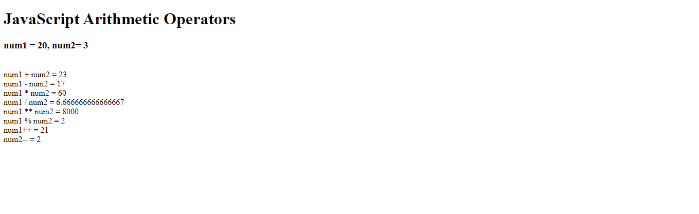 document.write("<h3>num1 = 20, num2= 3 </h3>")