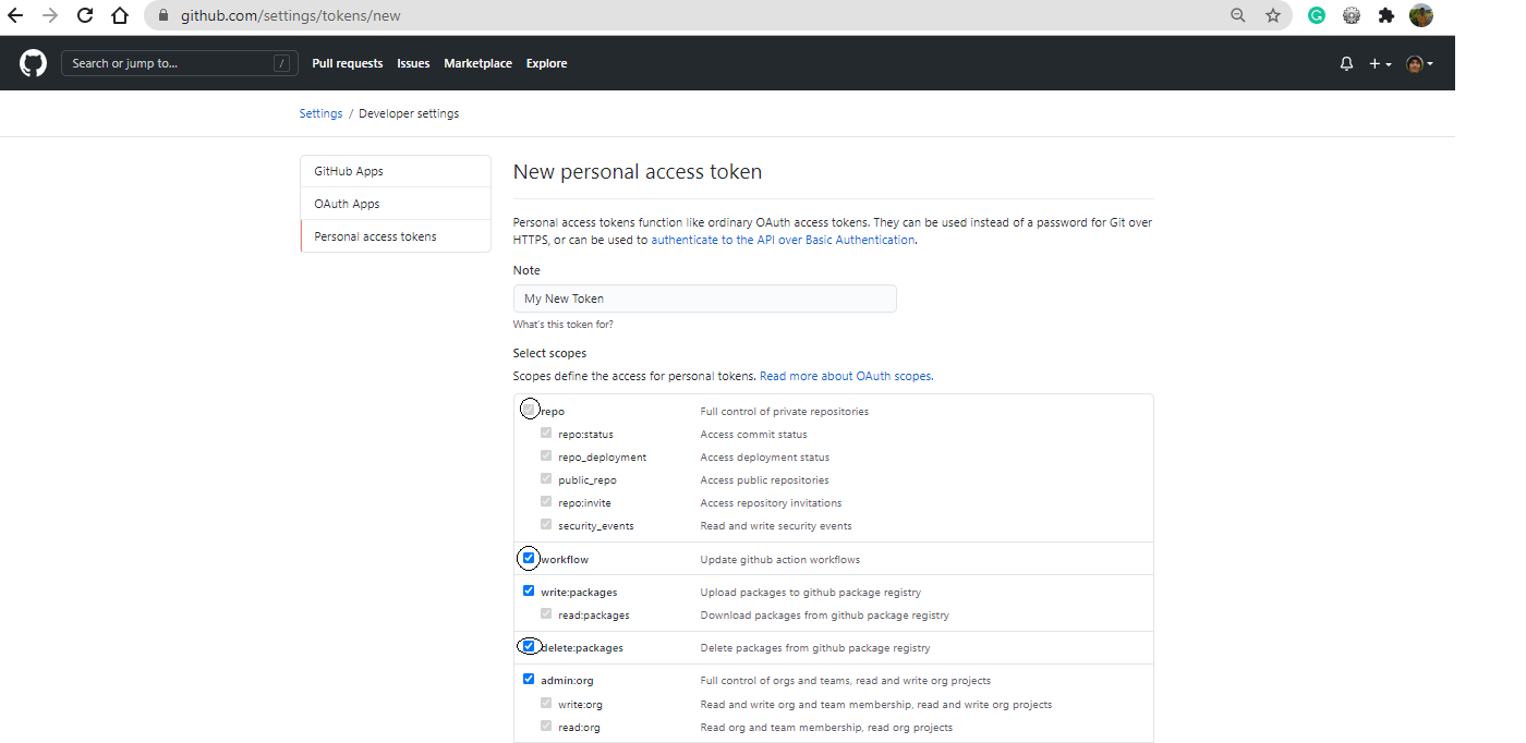 When you generate the access token, make sure that you have checked all the required boxes shown below.