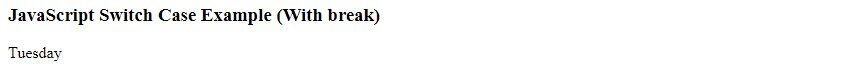document.write("<h3> JavaScript Switch Case Example (With break)</h3>");