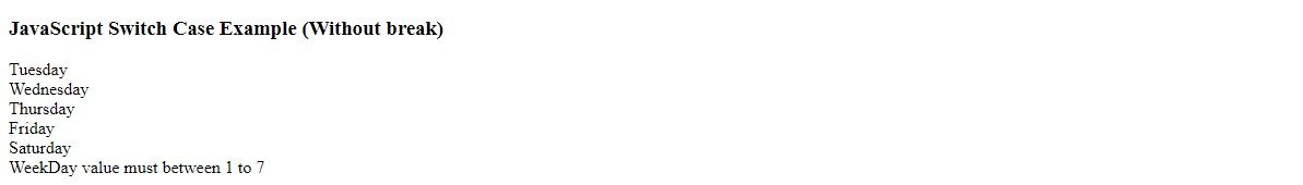 document.write("<h3> JavaScript Switch Case Example (Without break)</h3>");