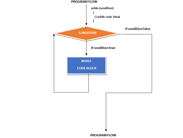 In the above while loop flow chart you can see that, the block of while loop code will keep on executing till the condition of while loop is true. In case if the while loop condition remains true, you will encounter an infinite loop, where the while loop code block keeps executing until you close the browser. An infinite loop is a bug that you do not want to be in your program so be careful with the condition you put with while loop. If the condition is false, to begin with, the code block of the while loop will not execute at all.