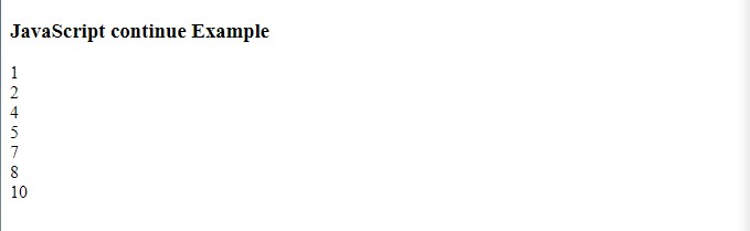 document.write("<h3> JavaScript continue Example</h3>");