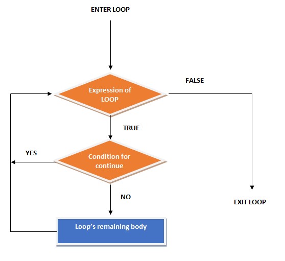 If a loop contains a continue statement, at the moment the continue statement executes in the loop body, it will skip the remaining loop's code block and go back to the loop's next iteration. Similar to the break statement we generally put the continue statement inside the condition block, so it only executes when a specific condition arises in the code.