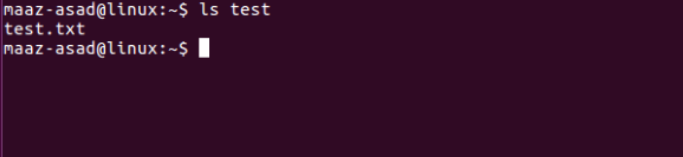 This command lists all the files and directories in the current working directory. For this, you just need to type ls in your terminal. However, the ls command can also list the content of other directories. For this, you will need to write the name of that particular directory after the command. For instance, the following command lists all the files and directories in the “ test ” directory: