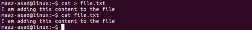 Let’s also create a new file named “file.txt” and add content to it at the time of creation. Type the following command in the terminal and press Enter to add the content to this file. To save the file once the content is added, press Ctrl+D .