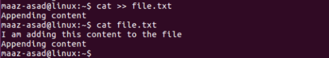 It is a frequently used command in Linux that is used to display, create and manage the content of multiple files. As we discussed earlier, the touch command is used to create an empty file in your system. In many cases, you may need to insert some content into the file during its creation. The cat command can be a handy tool in this case. You can also view the content of the existing files using the following command: