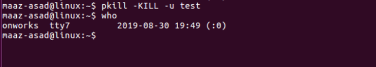 Linux also provides you the power to end the session of other users. However, you need to be a root user in order to perform this task. The ‘ who’ command can be used to see the list of users that are currently logged in to your system. Ending the session of another user can be done by using the pkill command. The syntax for this is: