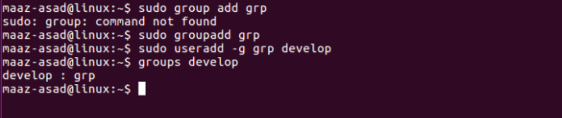 Similar to the above examples, groupadd requires you to be a root user to run the command. Let’s create a new user named “develop” and add it to the existing group. To add the user in the group while creating it, we need to specify the -g option with the useradd command.
