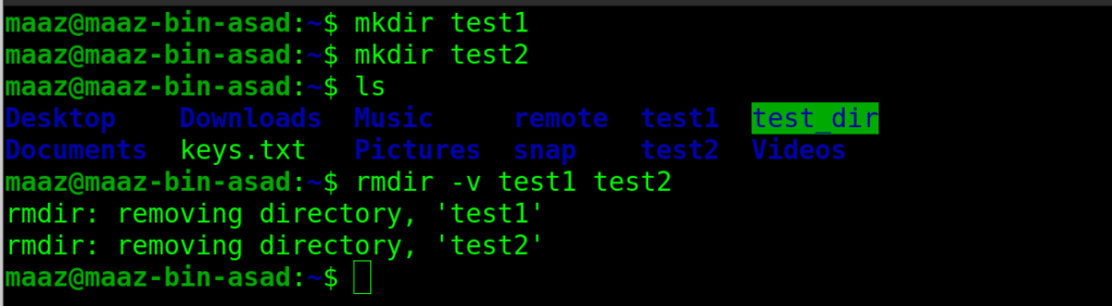 In this article, we discussed the rmdir command in Linux. Deleting a (set of) directory is a common task while working on Linux-based projects. This task can be accomplished by using the rmdir command. Please note that the Linux shell command only deletes empty directories and skips deleting non-empty directories. You can also delete multiple directories in the same directory using the rmdir command. Also, to get the deletion verification message, use the -v option.