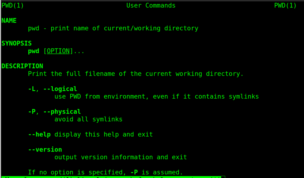 You may obtain the instructional page of the pwd command by using one single command. It's always recommended to have a look at the manual of every command so that you get familiar with the options and other utilities that particular command provides. The following command will list all the details regarding the pwd command in your terminal: