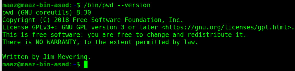 You will get an output like the one shown below: 2. Print the version of pwd in the terminal: