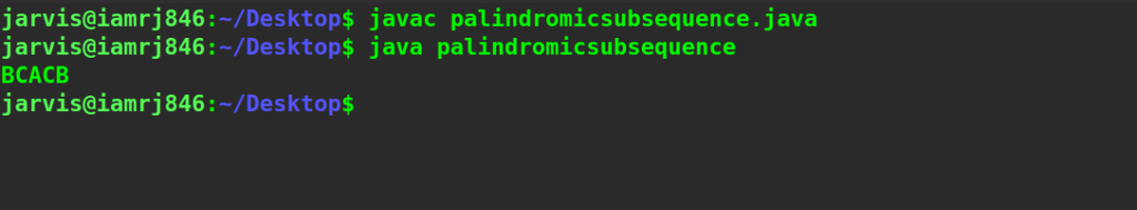 for (int x = 0; x < lcstore.length; x++) { answer += lcstore[x]; } return answer; } // Returns str's longest palindromic subsequence. static String lps(String str2) { //Find the opposite of str. String rev = str2; rev = reverse(rev); // Return the LCS of str as well as its inverse. return lcs(str2, rev); } static String reverse(String str3) { String answer = ""; //toCharArray() converts a String to a character array. char[] try1 = str3.toCharArray(); for (int i = try1.length - 1; i >= 0; i--) {
