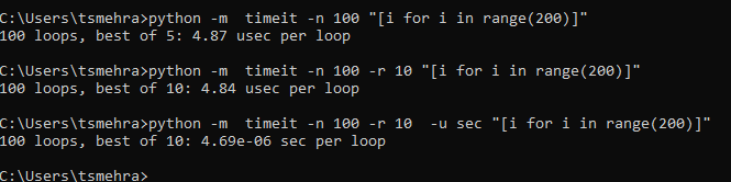 C:\Users\tsmehra>python -m timeit -n 100 -r 10 -u sec "[i for i in range(200)]"