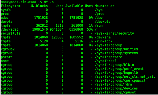 To display all filesystems, use the -a option with the command as shown below with an example.