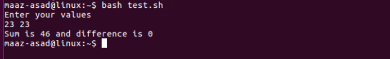 #!/bin/bash echo "Enter your values" read a b sum=$((a+b)) diff=$((a-b)) echo "Sum is $sum and difference is $diff"