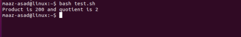 #!/bin/bash num1=10 num2=20 mul=$((num1*num2)) div=$((num2/num1)) echo "Product is $mul and quotient is $div"
