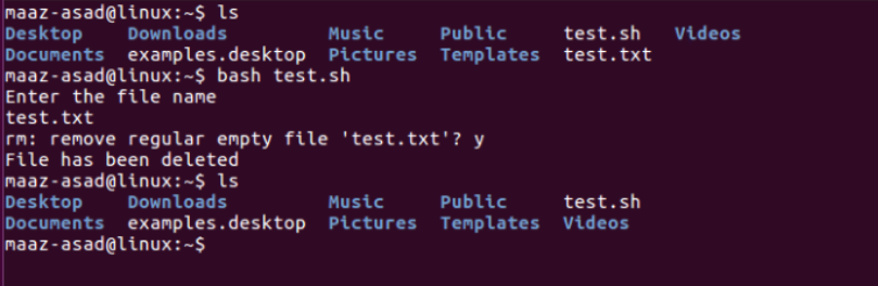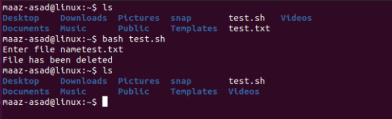 As you can see above, after running the script, the file test.txt is not present in the present working directory.