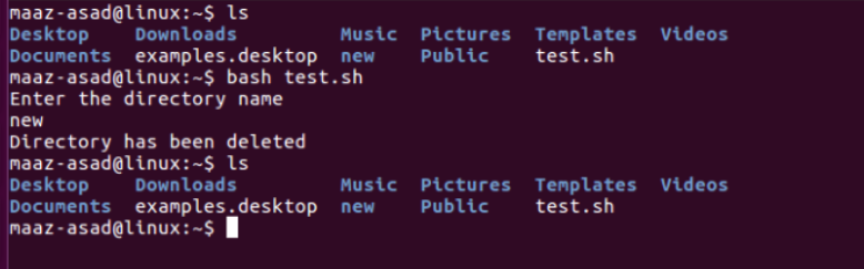 #!/bin/bash echo "Enter the directory name" read name rm -rf $name echo "Directory has been deleted