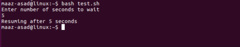 #!/bin/bash echo "Enter number of seconds to wait" read t sleep $t echo "Resuming after $t seconds!"