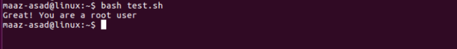 #!/bin/bash ROOT_UID=0 if [ "$UID" -eq "$ROOT_UID" ] then echo "Great! You are a root user" else echo "You are not the root user" fi
