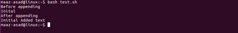 #!/bin/bash echo "Before appending" cat test.txt echo "Added text">> test.txt echo "After appending" cat test.txt