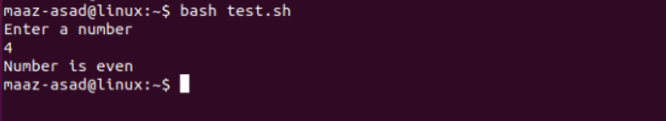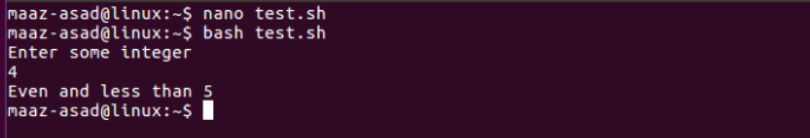 #!/bin/bash echo -n "Enter some integer:" read num if [[ ( $num -lt 5 ) && ( $num%2 -eq 0 ) ]]; then echo "Even and less than 5" else echo "Not satisfied above condition" fi