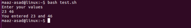 You can also take standard input for multiple variables using the ‘ read ’ command by separating them with space/s. An illustration for this is: