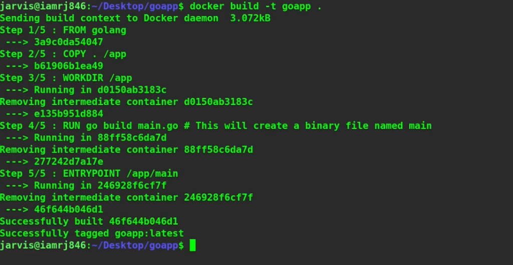 Here, we have not used any multistage build. We have simply pulled the golang base image from the Docker registry, copied the build context and set the working directory, used the RUN instruction to build the application, and create a binary file. And then, using the ENTRYPOINT instruction, we have instructed the daemon to execute the binary when we run the container. Let’s try to build this image.