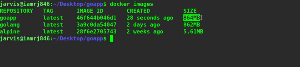 Let’s try to create the same application using a multi-stage build. We are building the image in two stages. First, we are using a Golang base image, copying our code inside it, and building our executable file called main. Now in the next stage, we are using a new Alpine base image and copying the binary which we built earlier to our new stage. An important point to note here is that the image built at each stage is entirely independent. Note the line with copy instruction lets you access data from inside the image built in the previous image using the “from” argument. Now, if we try to build it and check the size of the image, we will see a significant reduction in the size of the image. To demonstrate, let’s try to execute this example.